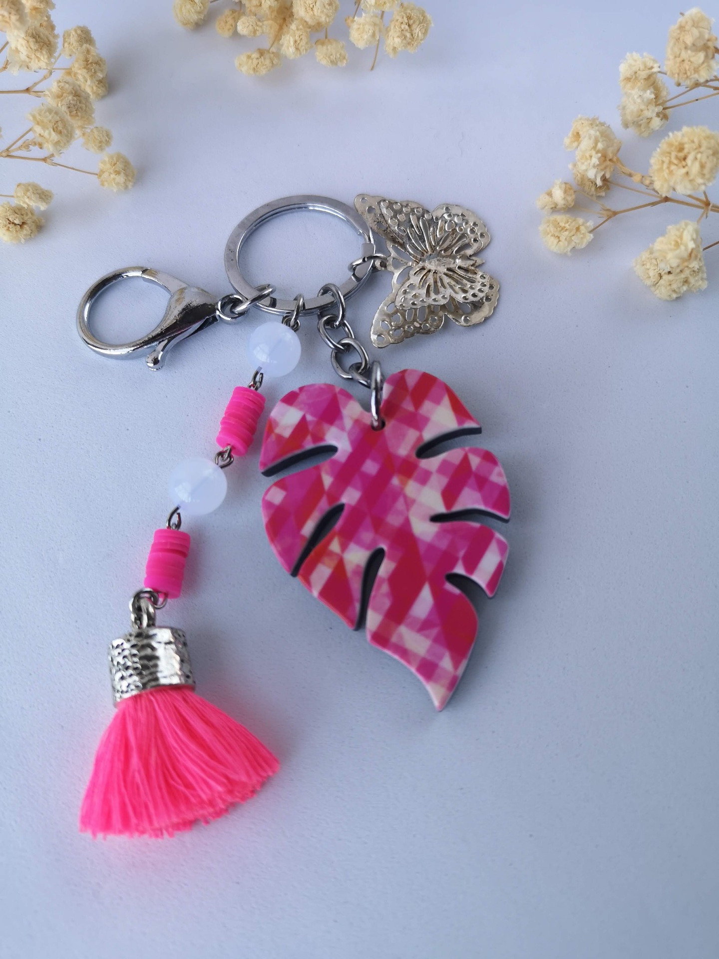 Porta-chaves alusivo à natureza, com uma folha em acrílico rosa e uma borboleta.
