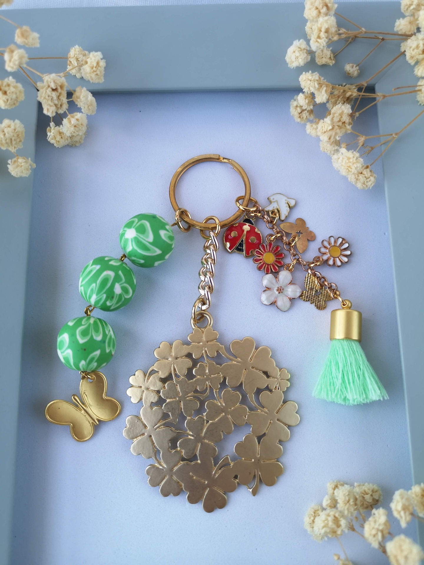 Porta-chaves alusivo à sorte com trevos.