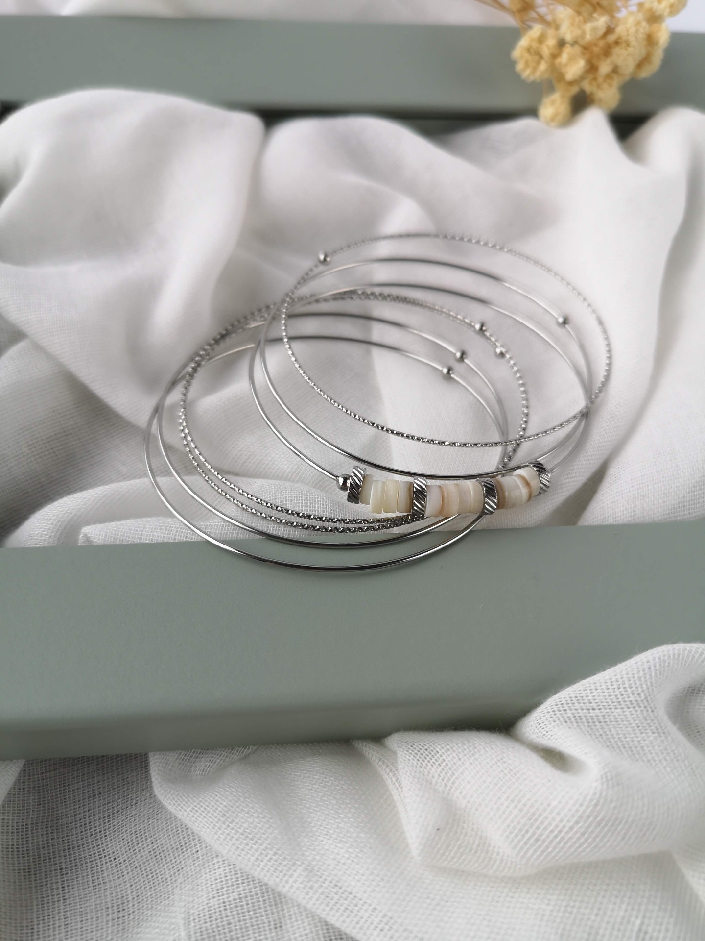 Conjunto de 7 pulseiras escravas em aço inoxidável prateado com detalhe em beje, garantindo durabilidade, brilho e resistência para o uso diário.