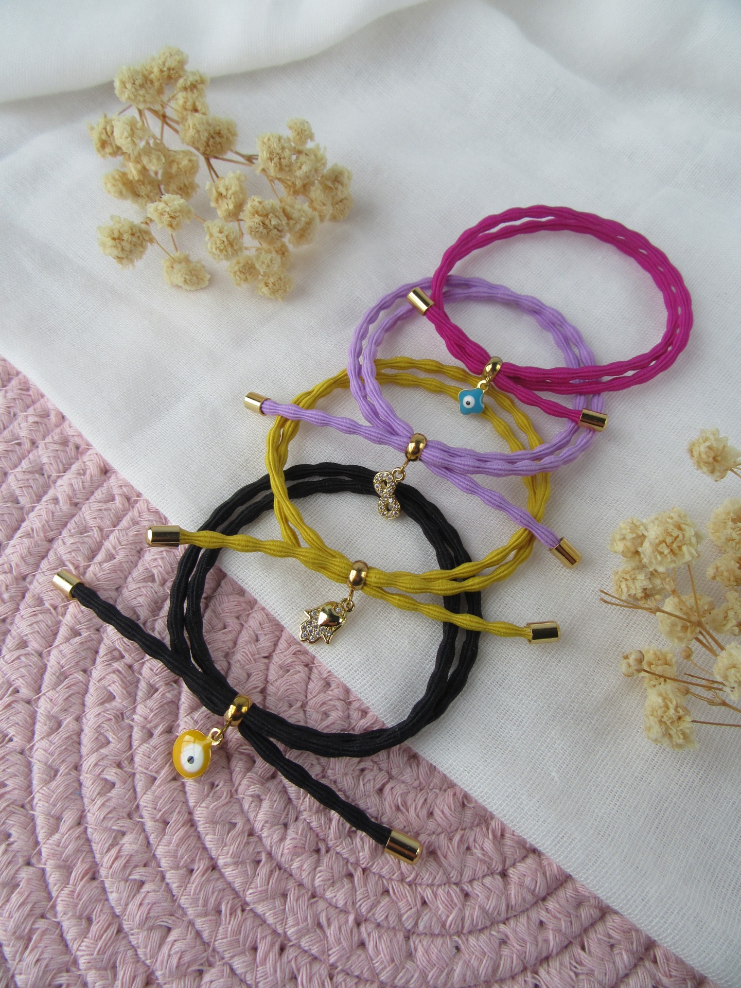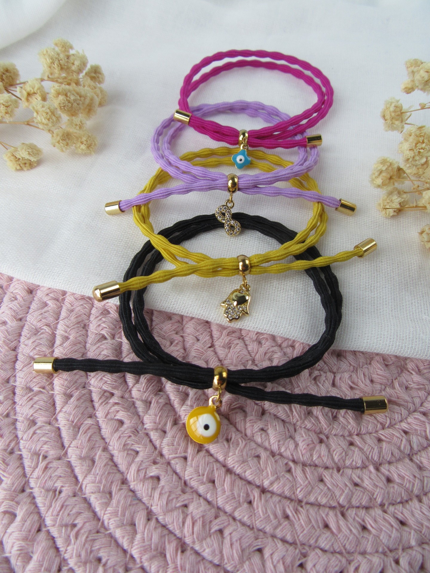 Pusleira elástica com terminais em aço inoxidável dourado, garantindo durabilidade, brilho e resistência para o uso diário, com medalhas.