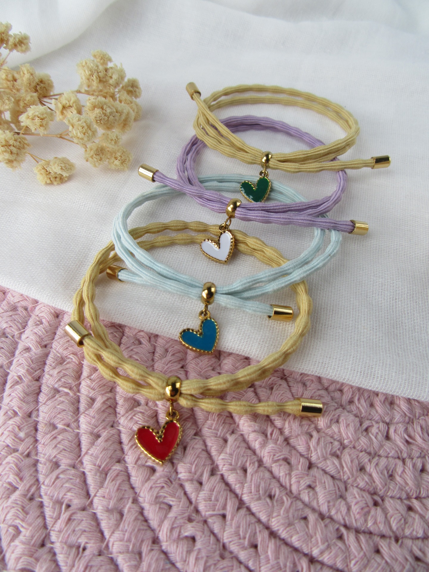 Pusleira elástica com terminais em aço inoxidável dourado, garantindo durabilidade, brilho e resistência para o uso diário, com medalhas em coração.